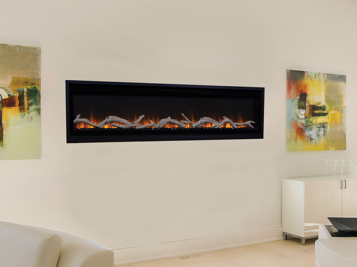ERL3000 Series electric fireplaces offer a large linear transitional design with a smoked crystal ember bed and driftwood log accents. Impressive dual-colored flame appearance combined with multi-color ember bed lighting and mood enhancing ceiling lighting offer breathtaking views and make ERL3000 fireplaces the focal point of any room.
